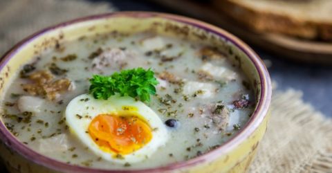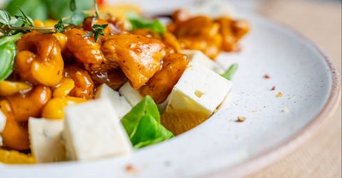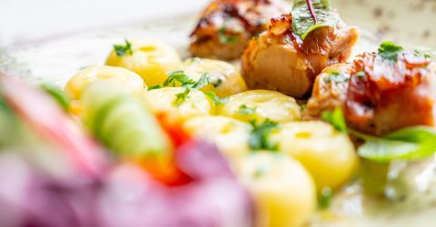 4. Filet z kurczaka zagrodowego Pieczony filet supreme z kurczaka zagrodowego faszerowany oscypkiem, podany z bukietem sałat i pieczonymi ziemniakami z sosem czosnkowym