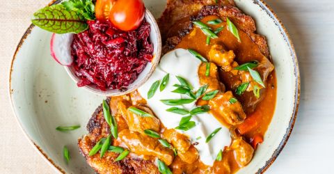 3. Filet z kaczki w sosie śliwkowym Pierś kacza sous vide, kluski śląskie, sos śliwkowy, knedle czeskie, sałata z czerwonej kapusty z jabłkiem